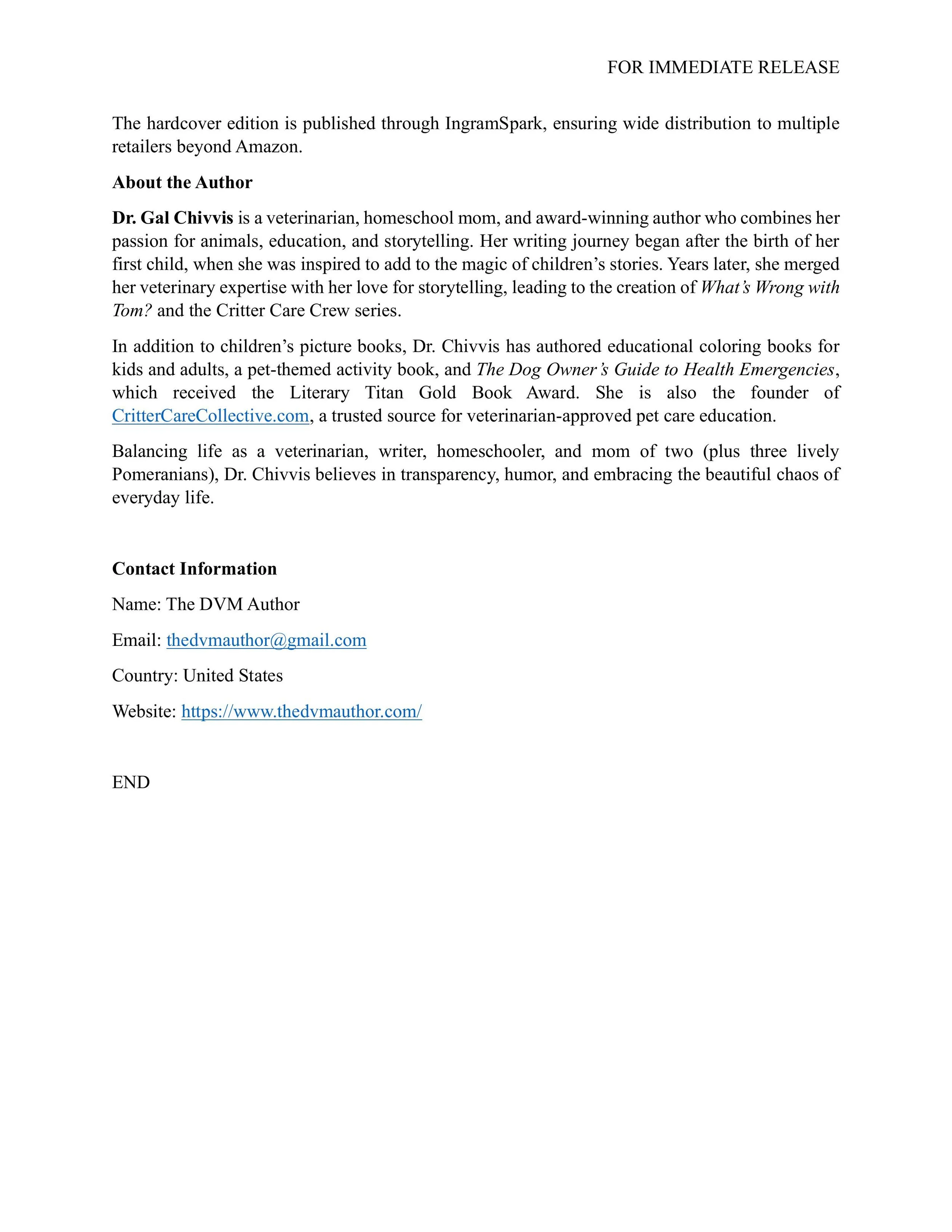 This is the official press release for What’s Wrong with Tom?, the first book in the Critter Care Crew series. It includes book details, early recognition, and author background. For media inquiries, interview requests, or additional materials, please see the Media Kit or contact me at TheDVMAuthor@gmail.com
